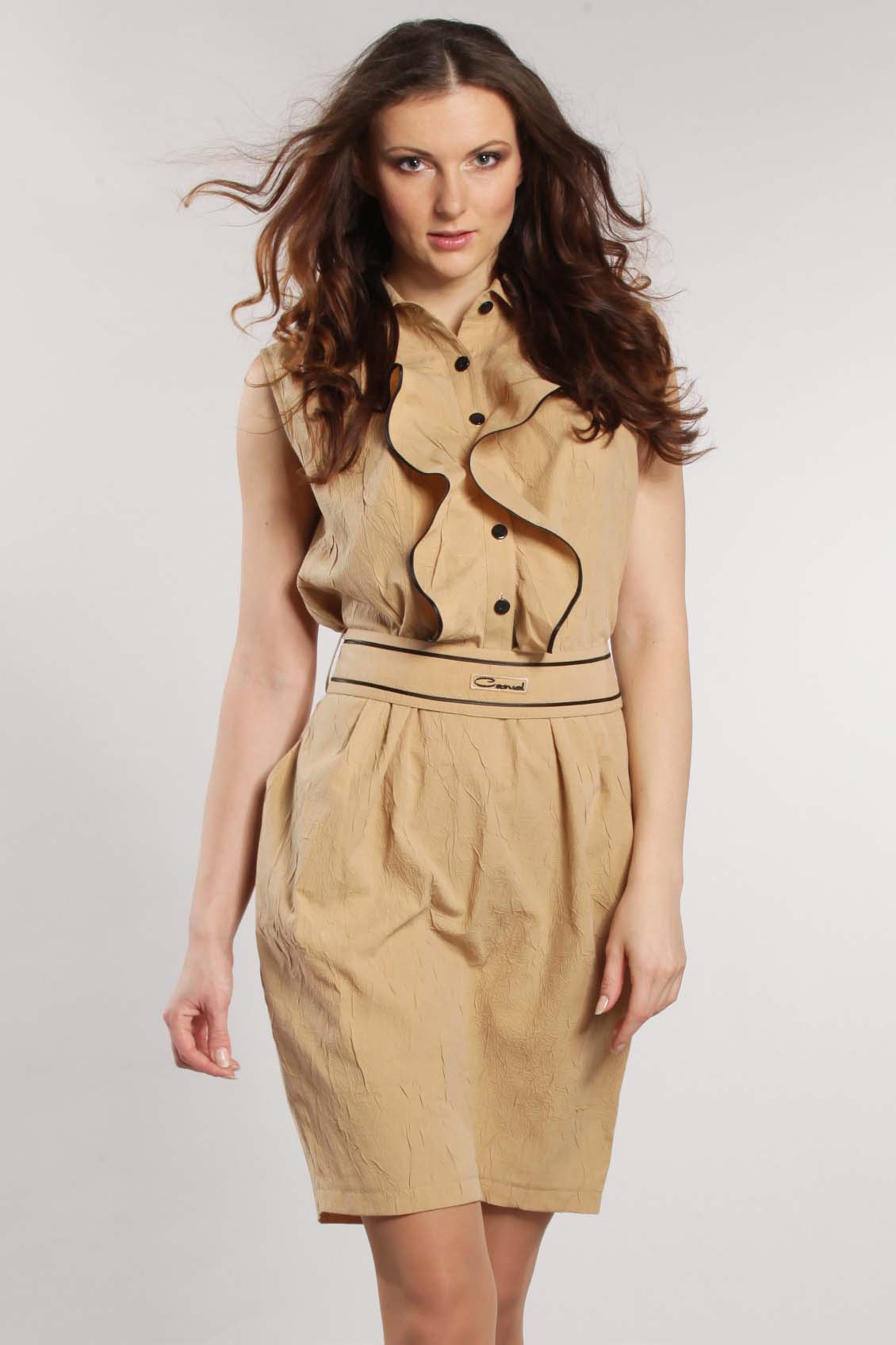 Легкое летнее платье из белой ткани с контрастной отделкой. Спинка выполнена из двух полотнищ со швом посередине, который заканчивается шлицей. По спинке проходят продольные рельефы, от линии талии мягко переходящие в вытачки. Вырез горловины круглый, обработанный отложным воротником на стойке. По полочкам расположена планка с прорезными петлями и пуговицами. Под планку встрочен широкий волан, который проходит вокруг горловины. Край волана обработан черной окантовочной тесьмой. На юбке по линии талии заложены мягкие глубокие склады. В боковом шве обработан карман. По линии талии модель застегивается сзади на пояс.