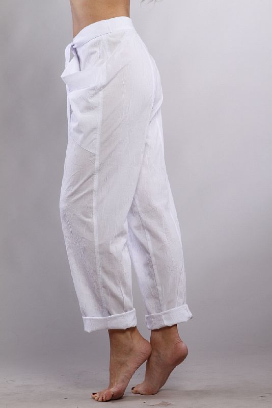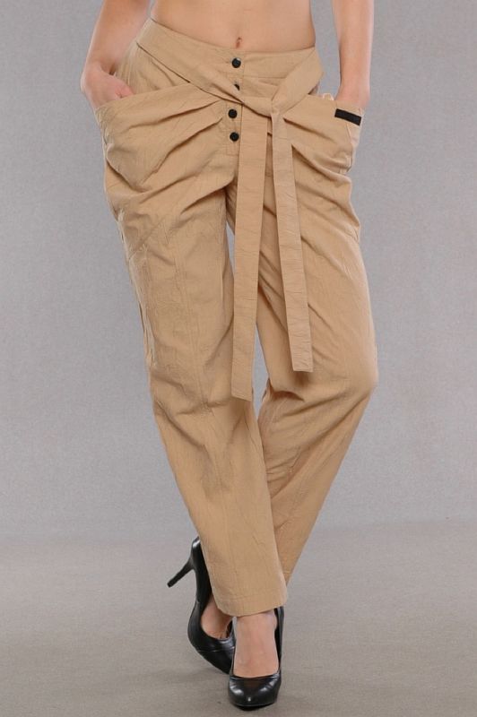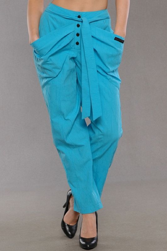 Широкие летние брюки, выполненные из легкой жатой ткани. По передним и задним половинкам брюк проходят продольные рельефы, отстроченные отделочной строчкой. По переднему полотнищу, начиная от гульфика, настрочена широко спадающая кокетка, которая благодаря заложенным глубоким складам образует карман. Модель застегивается по гульфику на кнопки черного цвета. По линии талии расположен пояс, который застегивается на кнопку, того же цвета что и на гульфике. В боковые швы пояса встрочен дополнительный пояс, который завязывается спереди узлом. Длина модели – до щиколоток. Низ отстрочен отделочной строчкой.