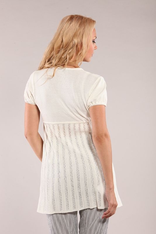 Свободный накидной джемпер из вязаного трикотажа светлого оттенка. Линия талии завышена и отстрочена. В нее продет вязаный шнур, который завязывается спереди узлом либо на бант. Верхняя часть выполнена сплошной вязкой без узора. Вырез горловины глубокий, V-образный, обработанный узкой окантовочной вязкой. Рукава короткие, присобранные в нижней части узкой резинкой. От линии талии вниз джемпер выполнен узорчатой вязкой с продольным декоративным рисунком, чередующийся узкими полосами. Длина модели – до линии середины бедра.