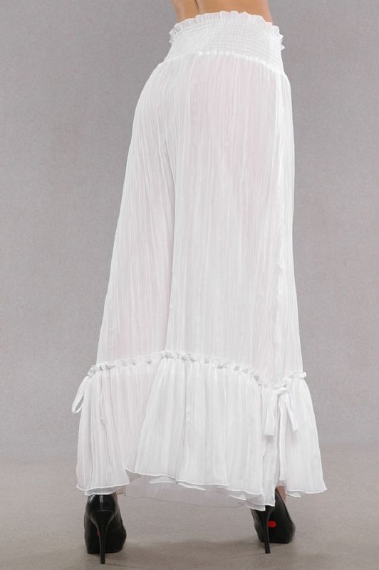 Длинная летняя юбка из жатого шифона белого цвета. Переднее и заднее полотнища цельнокроеные. По верху модели проходит широкий пояс в виде кокетки. По всему поясу настрочена узкая резинка в несколько продольных полос. Верхний край пояса образует рюш. По нижнему краю изделия настрочена широкая полоса из основного шифона таким образом, что верхний край этой полосы создает рюшевую отделку. По боковому шву по всей ширине настроченной широкой полосы проходят разрезы, декорированные завязанными бантами из основного материала. Нижний край изделия обработан строчкой «зигзаг».