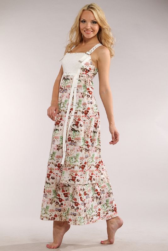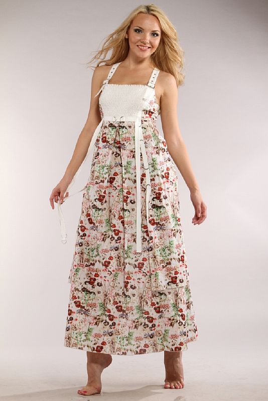 Летний легкий сарафан выполненный из ткани яркой расцветки. Завышенная линия талии подчеркнута широкой втачной кокеткой расположенной в центральной части полочки. Кокетка выстрочена узкой резинкой, в верхней части образующей узкий рюш. Бретели выполнены из белой ткани, и застегиваются на пряжки, что позволяет регулировать высоту груди. По краям кокетка обработана настрочными полосами из отделочной белой тесьмы со встроченными по ней полукольцами. В верхней части юбки заложена глубокая склада, благодаря которой юбка расширяется к низу. Длина изделия – до щиколоток.