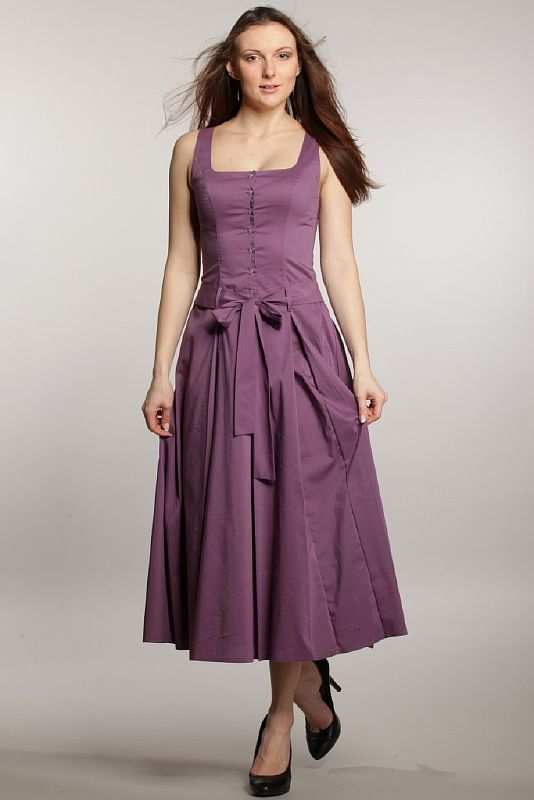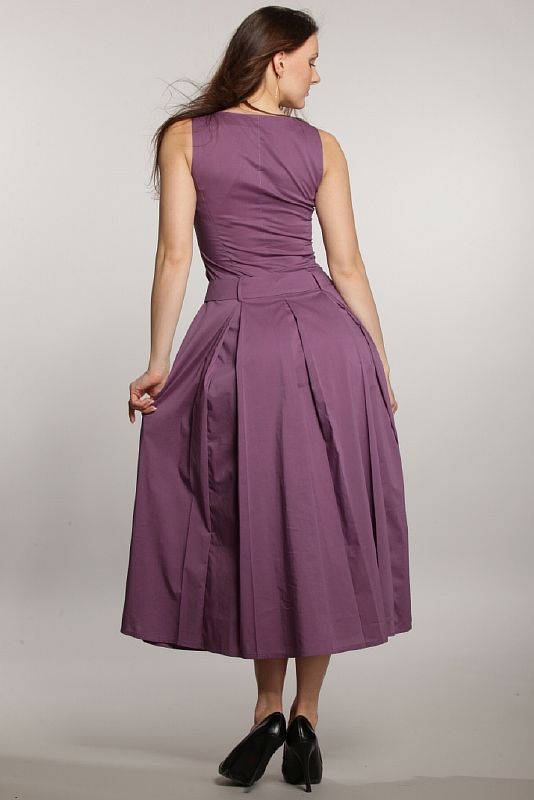 Легкий летний сарафан, выполненный из однотонной ткани. Вырез горловины в форме «каре» цельнокроеный с бретельками. Вырез горловины и проймы обработан подкройными обтачками. По полочкам проходят продольные рельефы, которые мягко переходят в глубокие встречные склады на юбке. Такие же рельефы и склады расположены на спинке изделия. Спереди по полочке модель застегивается на семь прорезных петель и пуговиц. По линии талии на рельефах настрочены узкие шлевки, в которые продет мягкий пояс из основной ткани, завязывающийся спереди бантом. Длина модели – до середины икры. Низ модели подогнут и обработан.