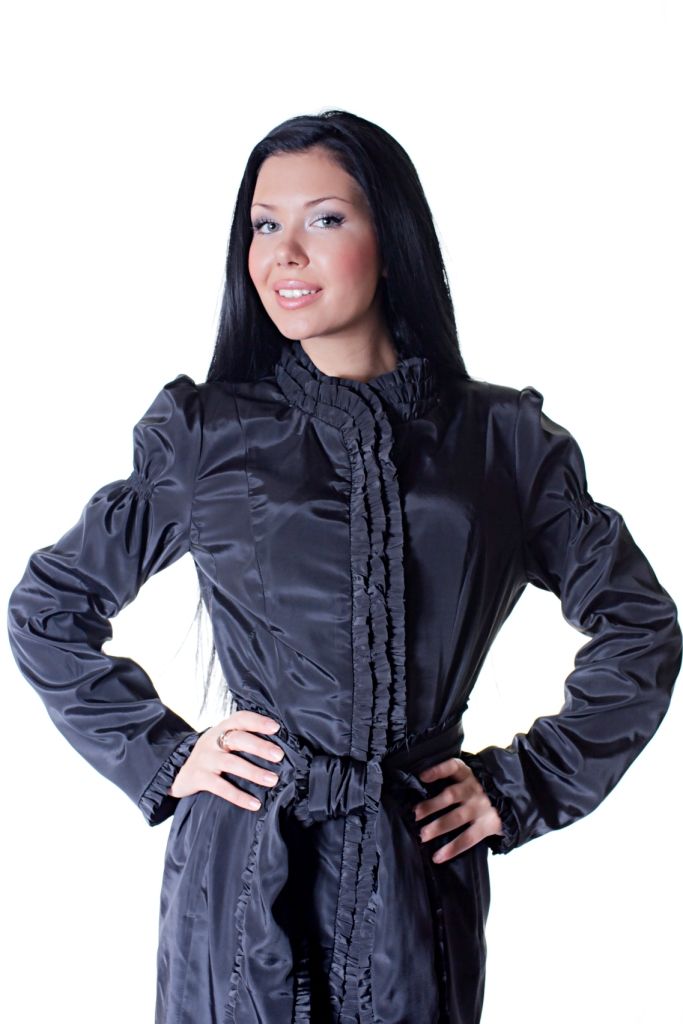 Плащ элегантного прямого покроя, приталенный, хорошо стройнит и придает фигуре утонченность. Мелкие рюши, украшающие полочку и широкий пояс, придают Вам дополнительную женственность. Длина плаща до колен очень актуальна и подойдет к любому типу фигуры. Плащ имеет удобные карманы и подкладку.