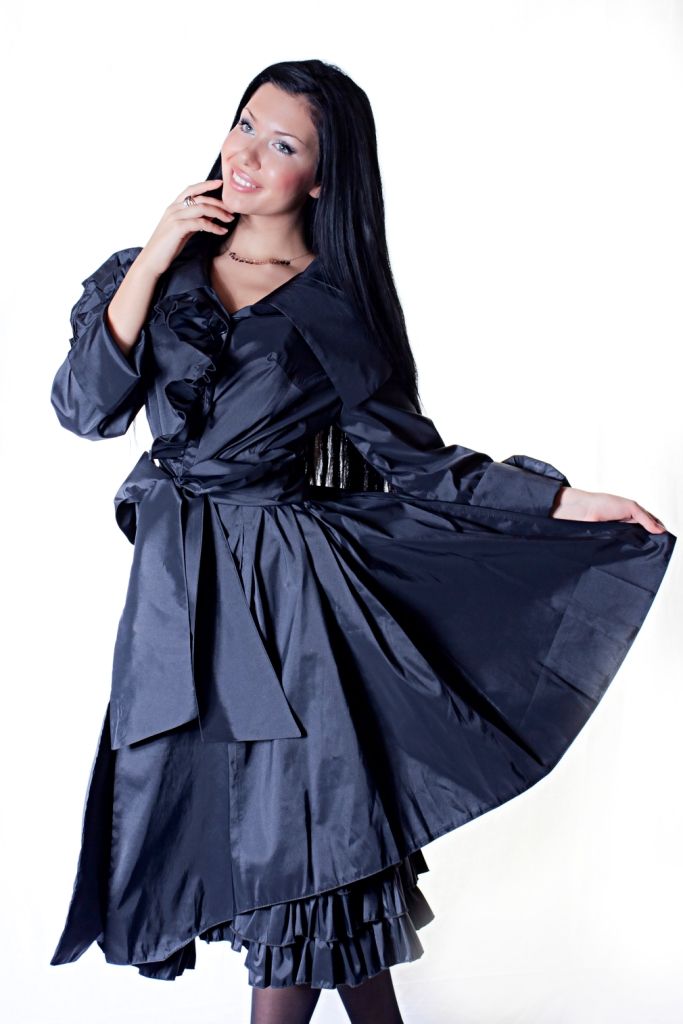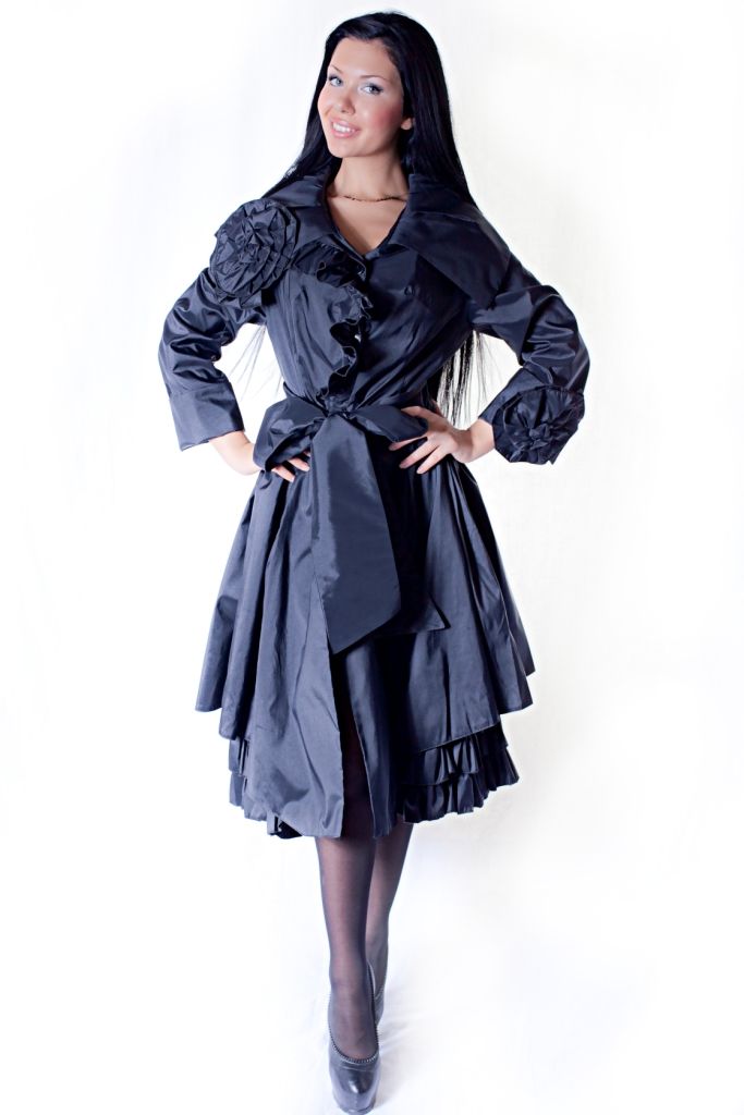 Приталенный верх и широкая юбка с рюшами по низу подола придают плащу сходство с коктейльными платьями середины прошлого века, подчеркивают стройную фигуру и выглядят женственно и сексуально. Широкий шалевый воротник гармонирует с поясом и большими манжетами. А декорирование рукавов и воротника шикарными цветами придает плащу особое очарование и делает его фаворитом Вашего гардероба.