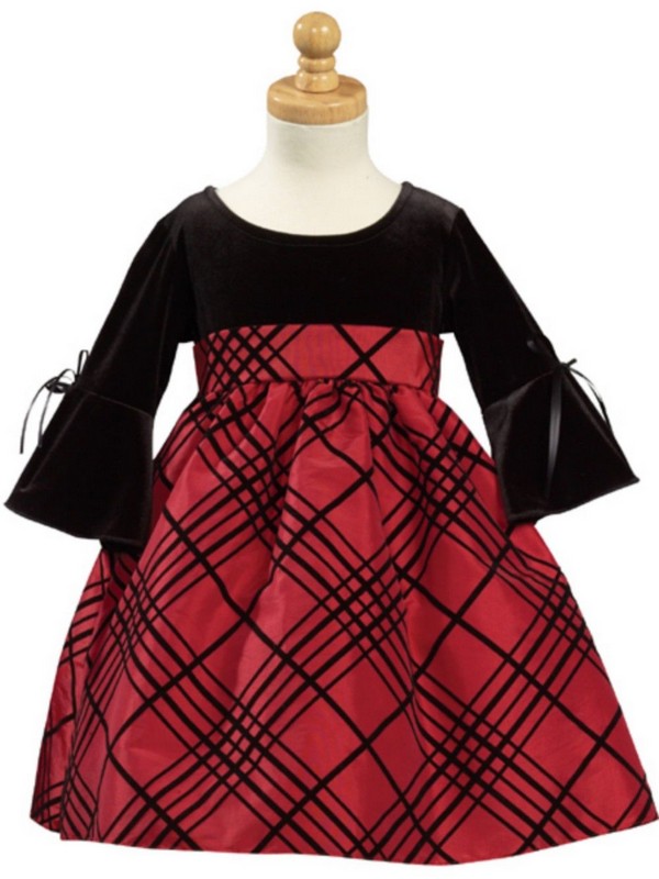 Детское нарядное платье, выполненное из комбинированных тканей темных оттенков. Модель отрезная по линии талии. Верхняя часть платья выполнена из бархата черничного цвета. Вырез горловины круглый и обработан отделочной строчкой. Рукава длиною три четверти, расширяются к низу. По низу рукава проходит широкий свободный манжет. По верхнему шву притачивания манжета в центральной части рукава пришиты декоративные бантики из узкой атласной тесьмы. Юбка выполнена из атласной ткани темно-графитового цвета в крупную клетку. По низу модель обработана строчкой «зигзаг». Изделие декорировано широким поясом из той же ткани что и юбка.