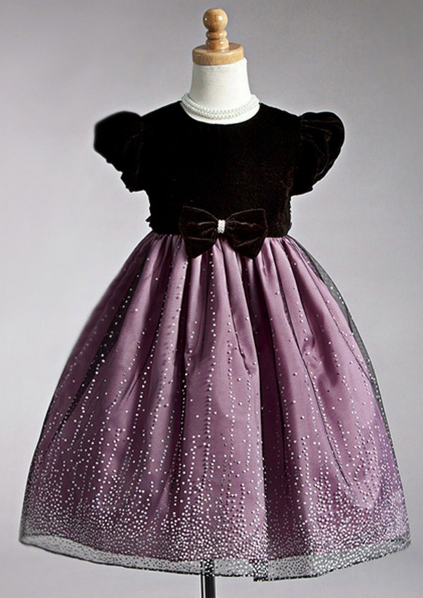 Детское бархатное платье темно-красного цвета. Платье отрезное по линии талии. Полочка цельнокроеная. Спинка состоит из двух частей со швом посередине. В этом шве расположена потайная застежка-молния. Рукава короткие, по окату присобраны. Нижняя часть рукава собрана на тонкую резинку. Вырез горловины круглый. Верхняя часть юбки присобрана по линии талии. К низу юбка расширяется. Поверх юбки расположен черный шифон, с выполненной на нем аппликацией в виде капелек белого цвета. По линии талии модель декорирована накладным бантом из основной ткани.
