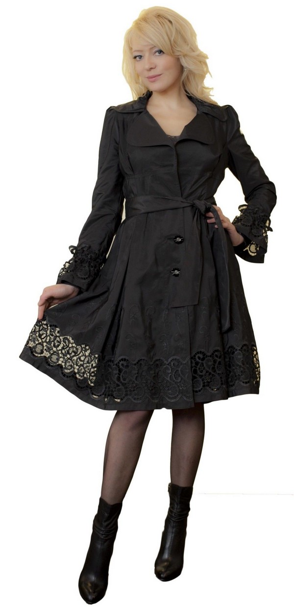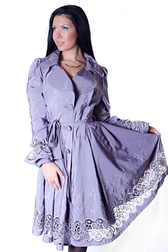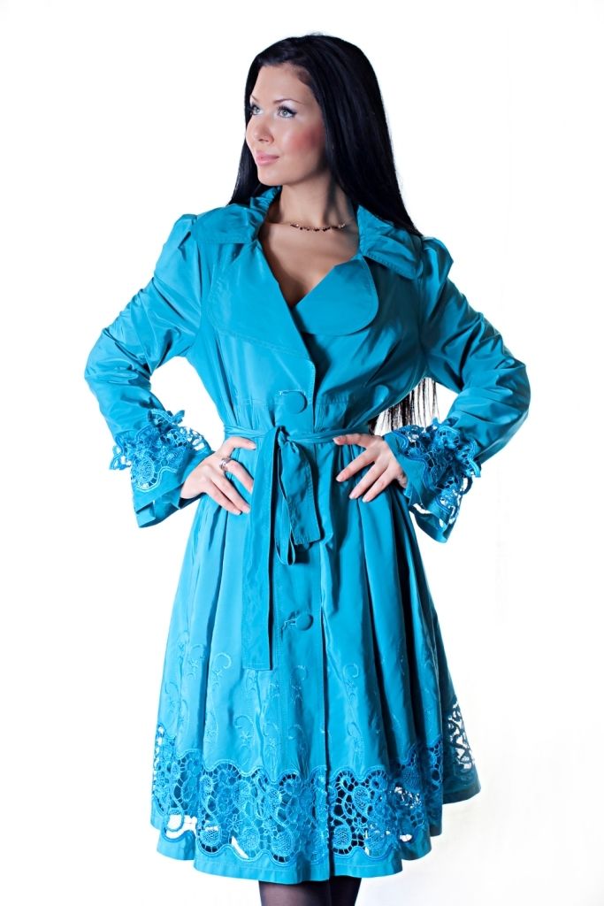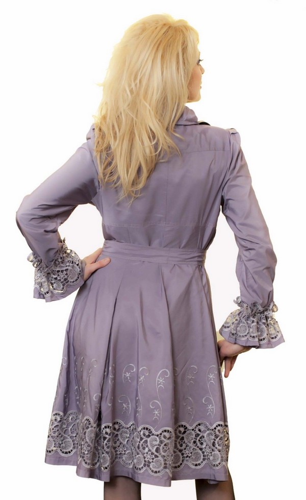Плащ классического покроя с приталенным верхом и расширяющейся юбкой благодаря интересному и красивому декору выглядит очень романтично и женственно. Ажур на широких манжетах и подоле юбки придает Вам легкость и воздушность, широкий воротник с глубоким вырезом красиво подчеркивает шею и особо понравится любительницам шейных платков и шарфиков, широкий пояс красиво обозначит талию.
