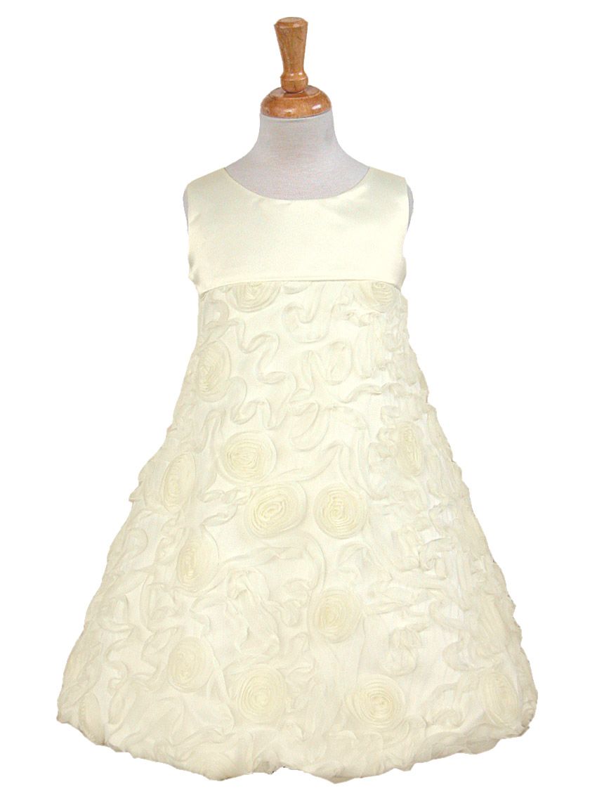 Праздничное детское бальное платье, выполненное в розовых тонах. Платье отрезное по линии груди. Верхняя часть изделия выполнена из атласа. Полочка и спинка цельнокроеные. Вырез горловины круглый, рукава отсутствуют. Модель посажена на подкладку. В левом боковом шве расположена застежка-молния. Нижняя часть платья выполнена из атласа и наложенного на него шифона. По шифоновой ткани настрочены узкие полоски и выполнены розы. Юбка двухшовная, расклешенная к низу. Низ юбки подогнут и пришит к низу подкладки. Длина модели – до щиколоток.