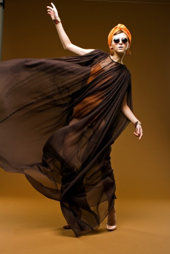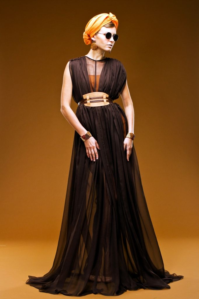 Отличительной особенностью данной модели является е необычный фасон. Лиф платья выполнен в виде двух широких бретель. Вырез декольте – V-образный, достаточно глубокий. Длина платья – в пол. Юбка свободная, «летящая».