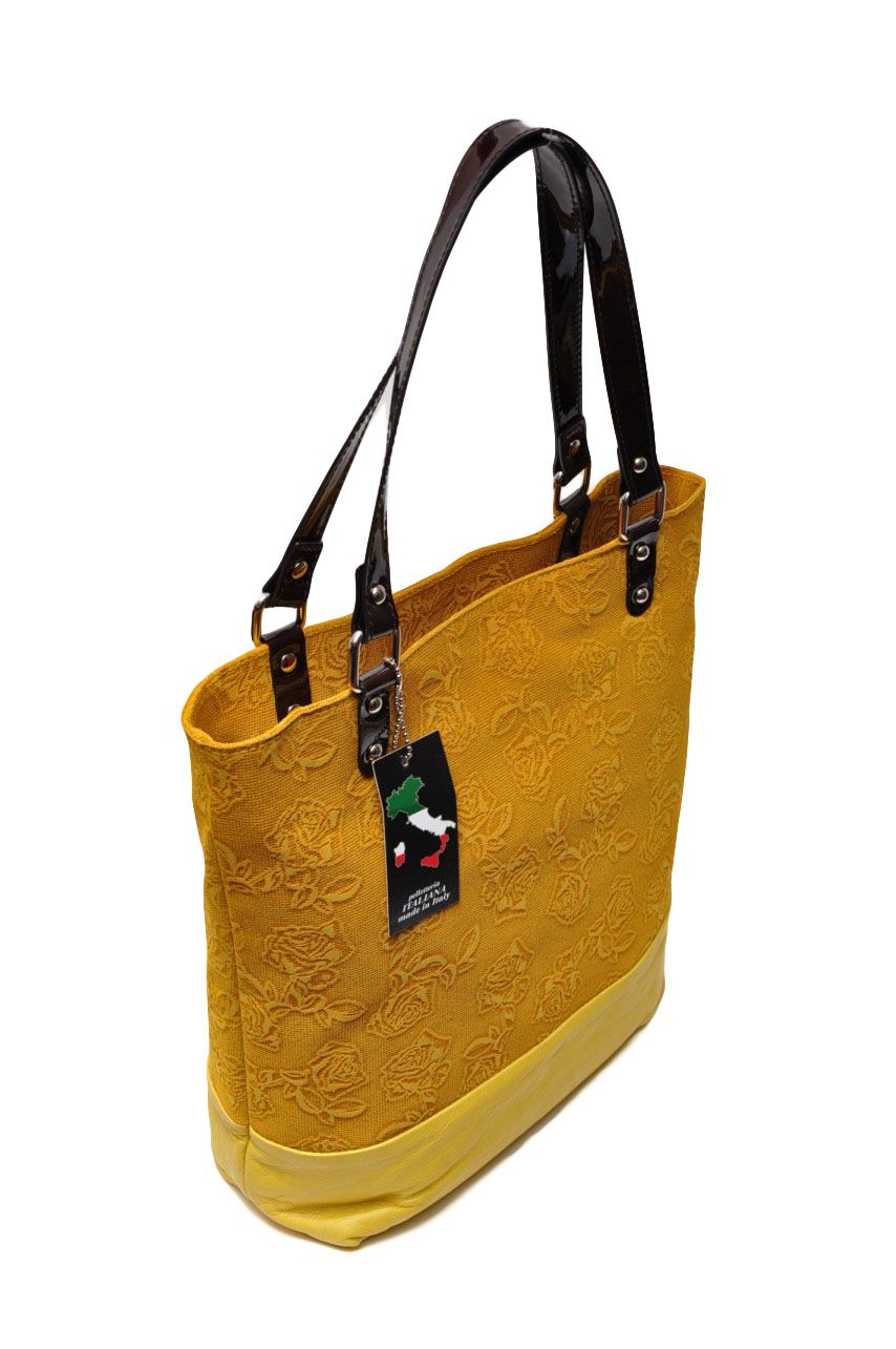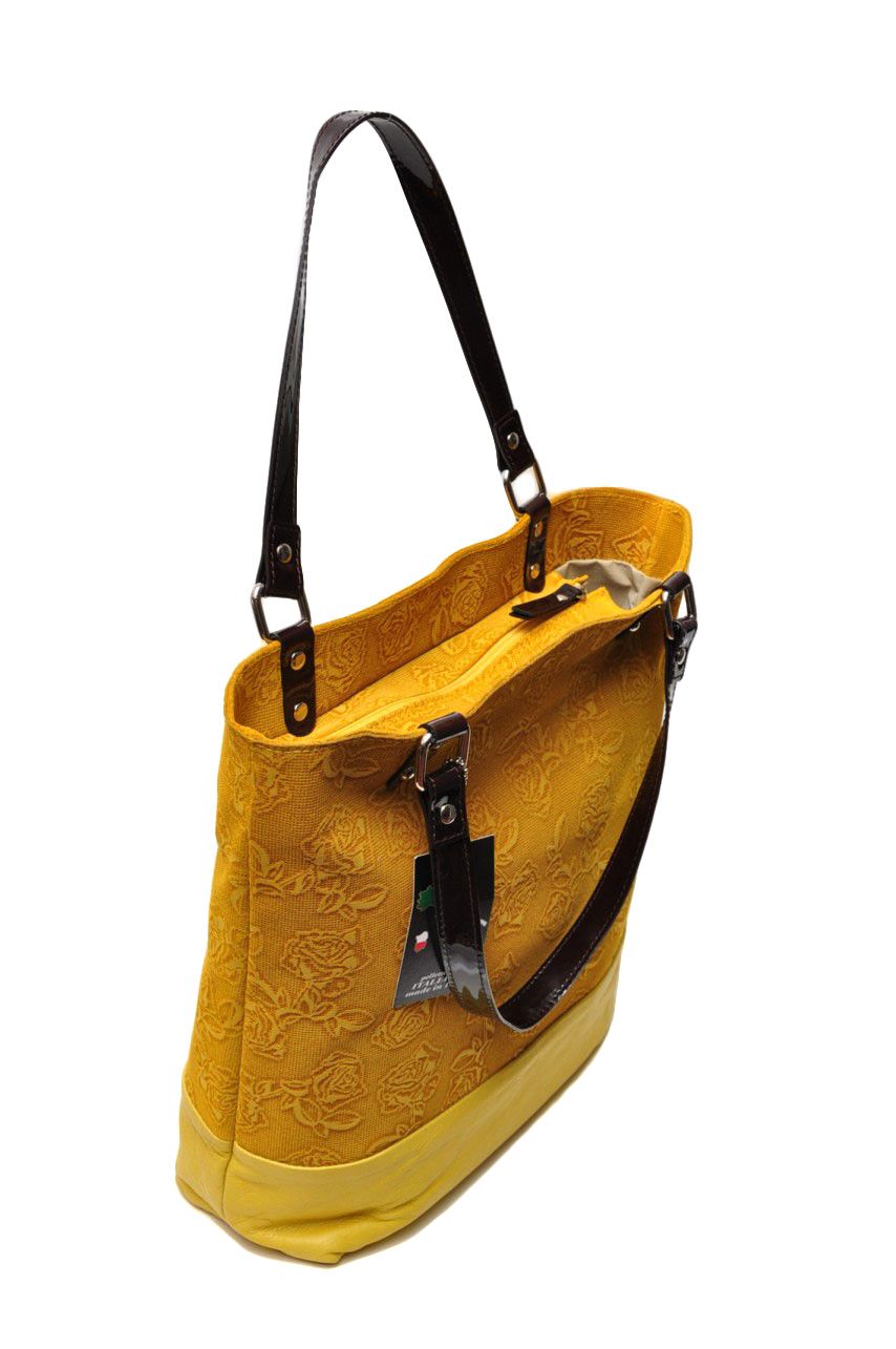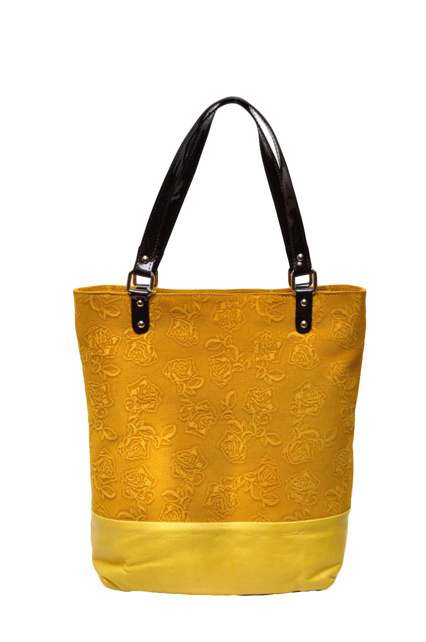 Благодаря комбинированию с гладкой кожей, узор выглядит ненавязчиво, прямые формы придают необходимую строгость, а черные контрастные ручки подчеркивают яркий, жизнерадостный цвет сумки.