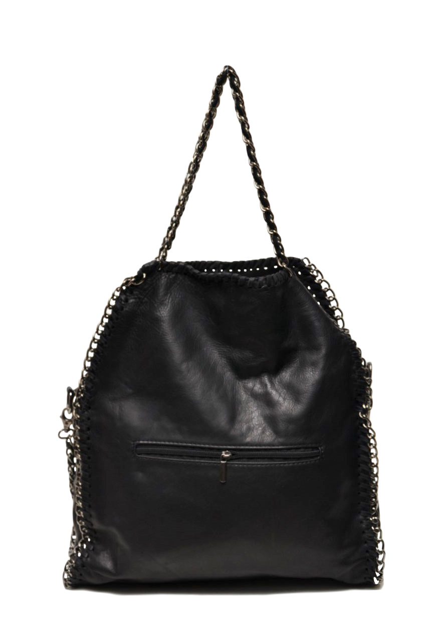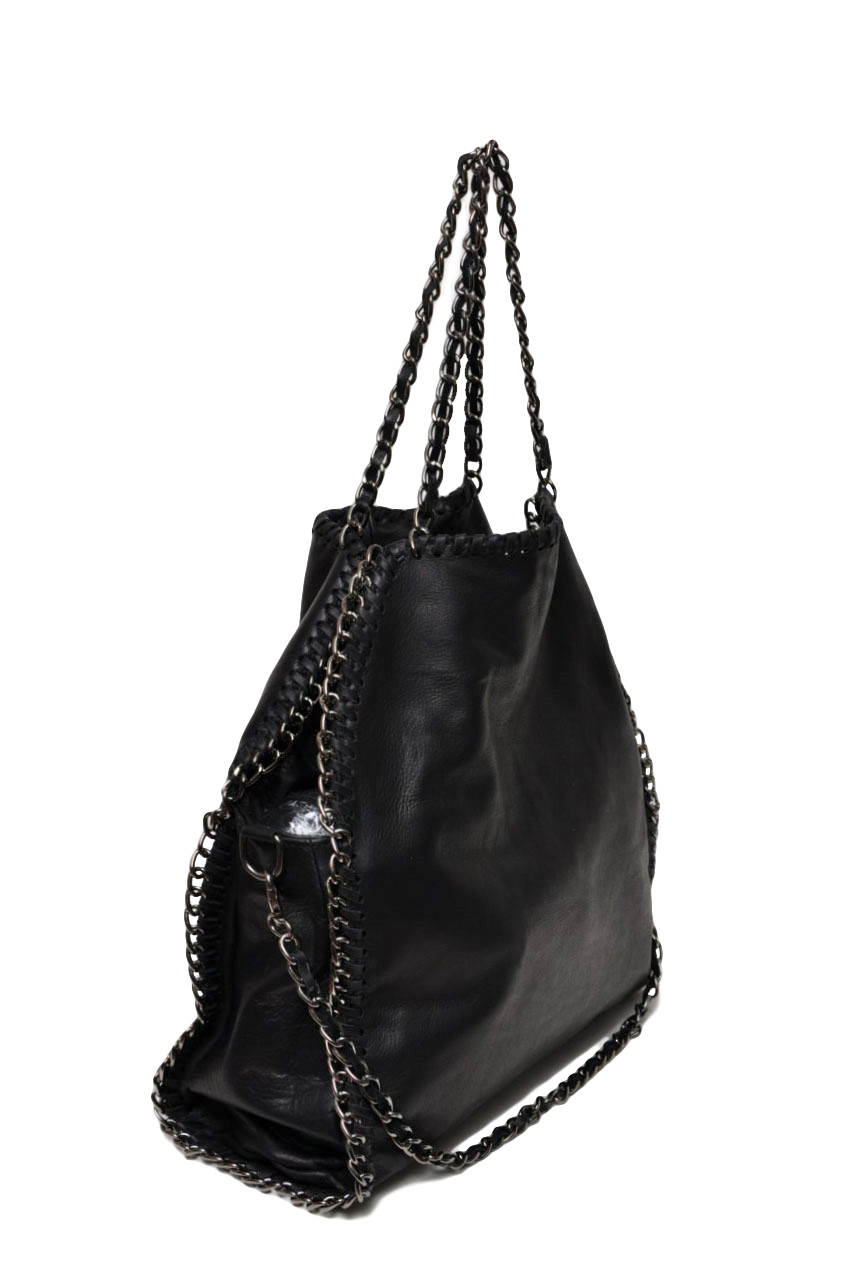 Все мастерство итальянских дизайнеров воплотилось в этой оригинальной сумке: простота и лаконичность формы играет на контрасте с необычной отделкой - все швы и края сумки словно опутаны цепью, которая продолжается как на коротких ручках, так и на длинном удобном ремешке. Нейтральный классический черный цвет подчеркивает оригинальность модели, придавая ей в то же время элегантный вид, что позволяет комбинировать ее с одеждой разных стилей, от спортивного до делового.