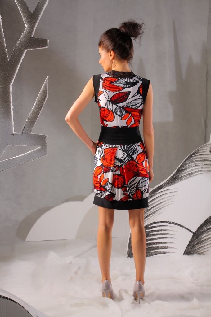 Длина платья – выше линии колен. Подол декорирован контрастной чёрной вставкой. По бокам, на бёдрах, имеются небольшие карманы.