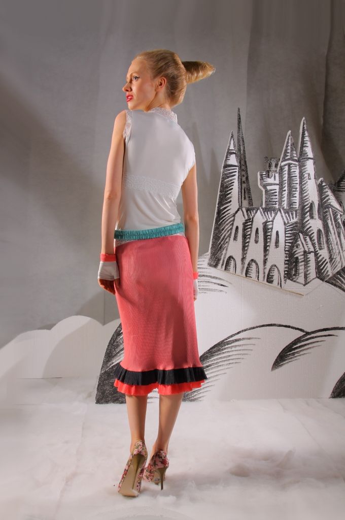 Невероятный и очень интересный фасон делает эту вещь неповторимой и привлекательной. Юбка имеет длину чуть ниже линии колен. Прямой покрой позволяет ей отлично садиться по фигуре. Подол немного расклешен, украшен небольшими воланами, которые делают этот наряд более привлекательным и необычным. Внизу имеется вставка из чёрной ткани, которая придаёт юбке пикантности. Модель отлично смотрится под обувь на высоком каблуке, а так же хорошо сочетается с разнообразными блузами.