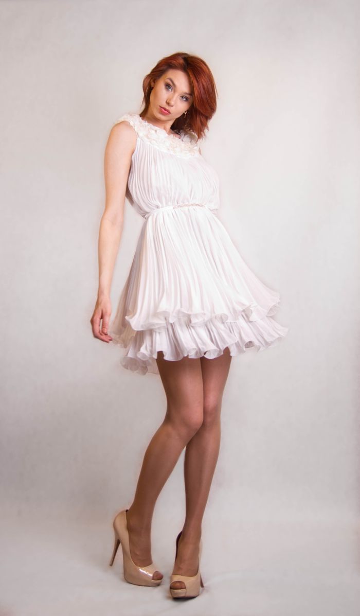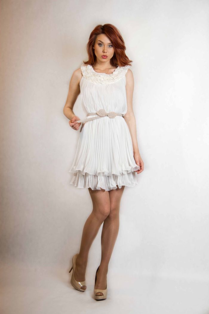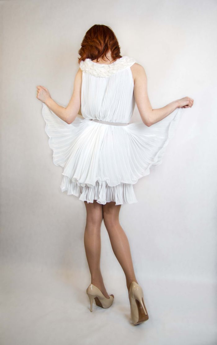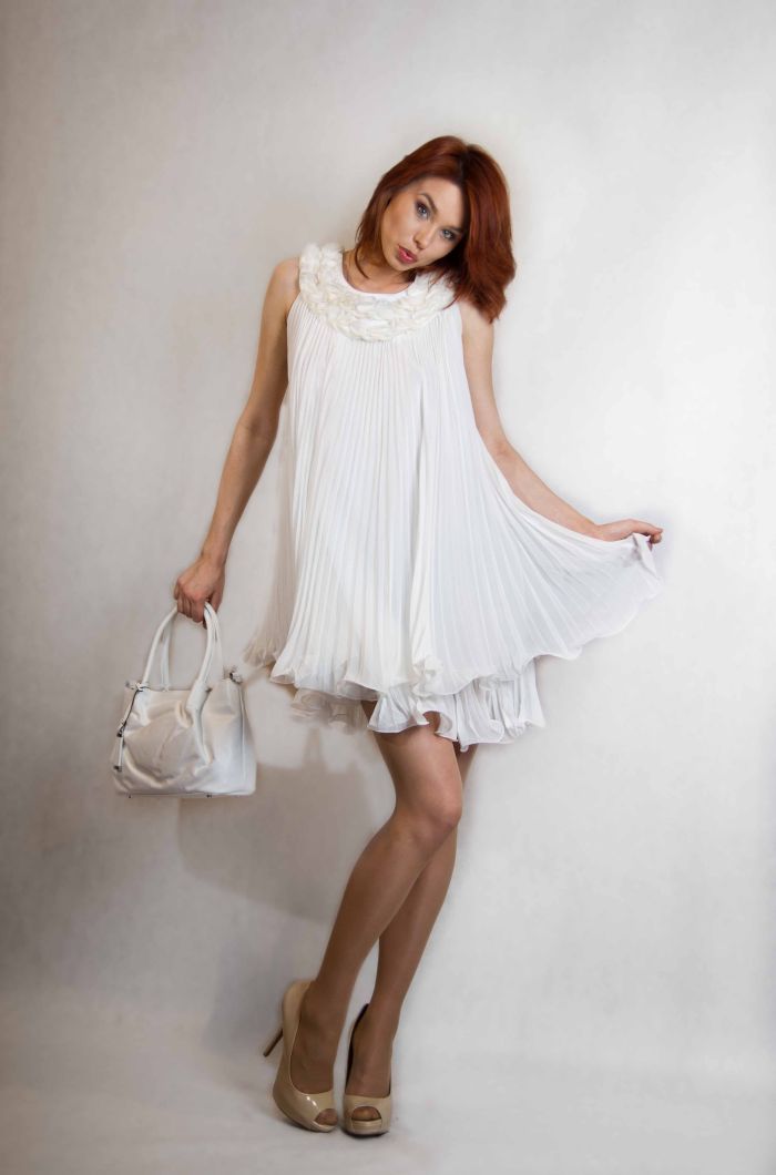 Удивительная модель, которая выглядит настолько совершенной, что не нуждается в дополнительных украшениях! Мини-длина, подчеркивающая стройные ноги, классический белый цвет, легкий свободный силуэт и нежная воздушная ткань-плиссе - вы безупречно выглядите в любой ситуации, будь-то зажигательная вечеринка, романтический вечер или просто поход по магазинам. Изюминка платья - отделка круглого воротника нежными лепестками из ткани.