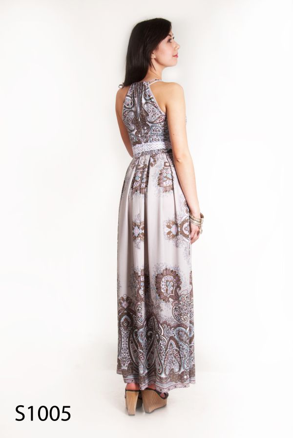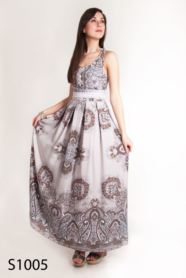 Платье имеет тонкие бретели, на которые собирается спинка, красиво обнажая плечи. Шикарный принт в нейтральных тонах привлекает внимание, а светлый оттенок фона прекрасно подчеркивает бронзовый загар.