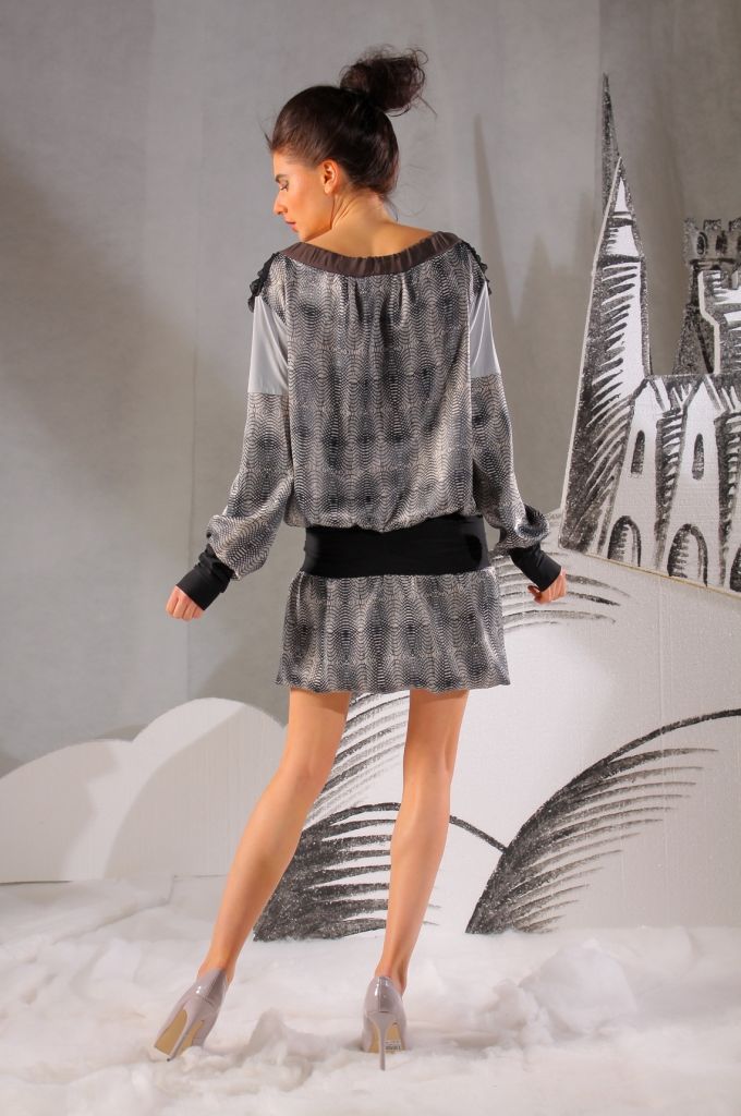 Данная модель отличается своим необычным фасоном и сочетанием тканей. Верхняя часть платья выполнена в виде свободной блузы. Рукава длинные, свободные. У основания имеются плотные чёрные манжеты. Вырез горловины – лодочка, декорирован коричневой атласной лентой, которая спереди завязывается на небольшой бант. Сверху спереди блуза декорирована чёрной тканевой вставкой.