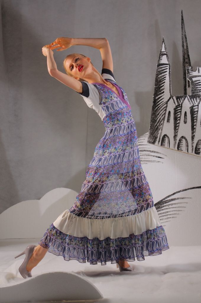 Платье отличается своей уникальной расцветкой и декоративными элементами. Длина платья – в пол. Рукава короткие, прикрывающие плечи. У основания украшены чёрными контрастными вставками. Вырез горловины – V-образный, так же окаймлён тонким тканевым лоскутом насыщенного сиреневого цвета.