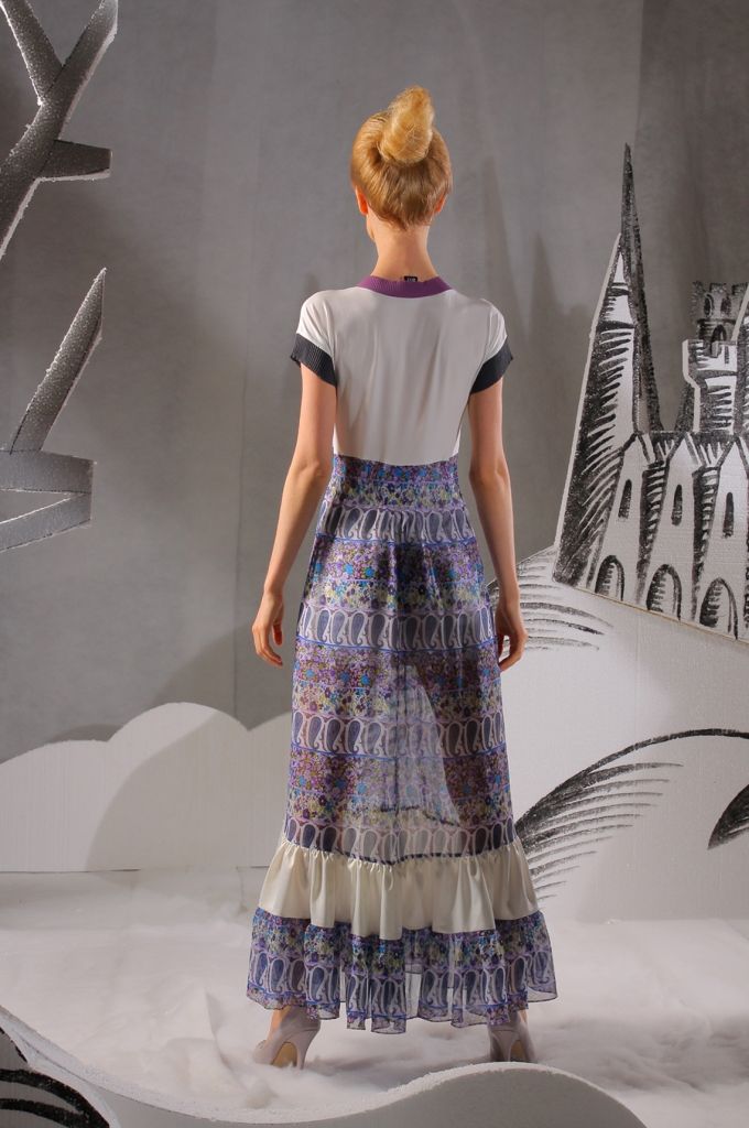 Подол платья расклешённый, украшен многочисленными вертикальными складками. Так же имеется декоративная вставка из белой ткани, которая придаёт платью пикантности и изюминки.