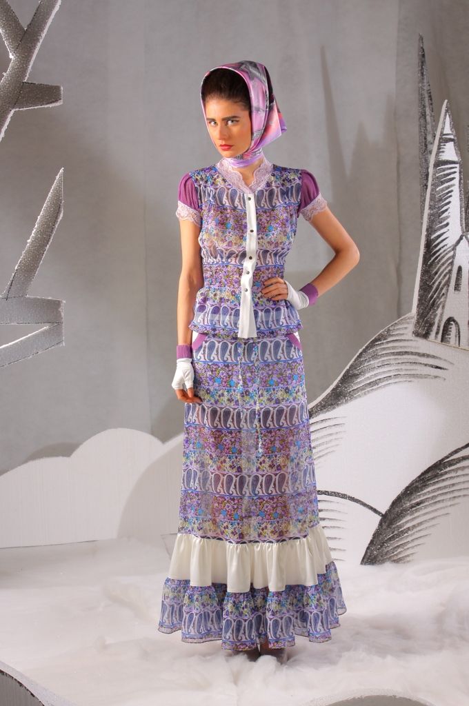 Блуза достаточно необычная и нарядная. Рукава короткие, у основания декорированы тонким кружевом. Вырез горловины – небольшой круг, окаймлённый светло-сиреневым кружевом, что позволяет акцентировать внимание на стройной шее. Блуза застёгивается спереди на несколько мелких кнопок.