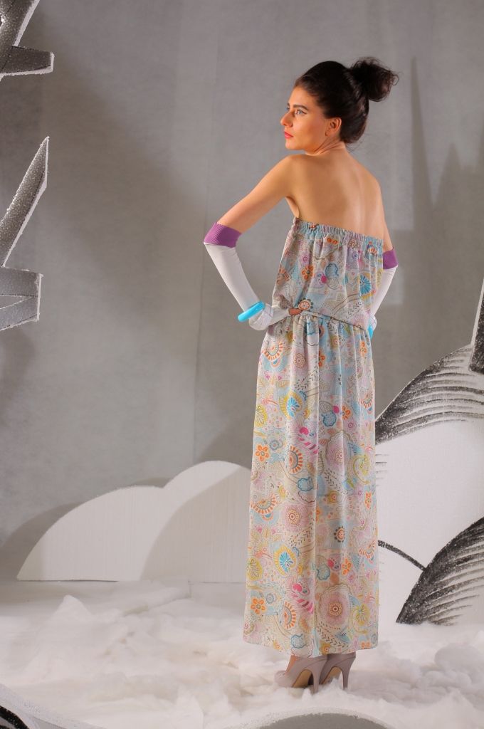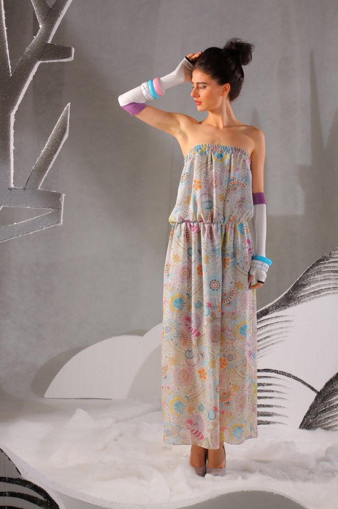 По линии талии проходит тонкая резинка, которая визуально делит платье на две части. Юбка свободная, прямая. Длина платья – в пол. Очень необычный и яркий наряд, который привлечет к вам многочисленные восхищённые взгляды!