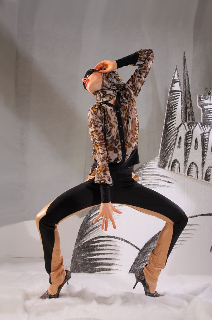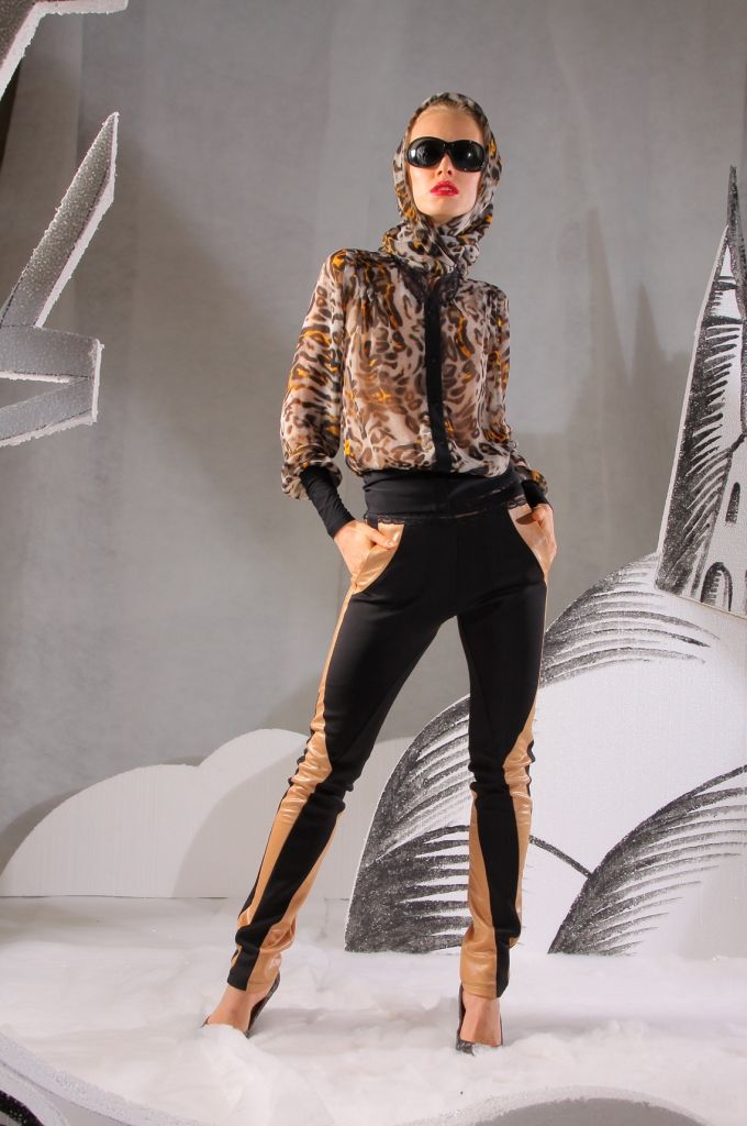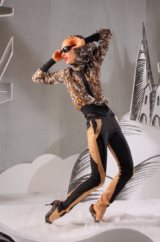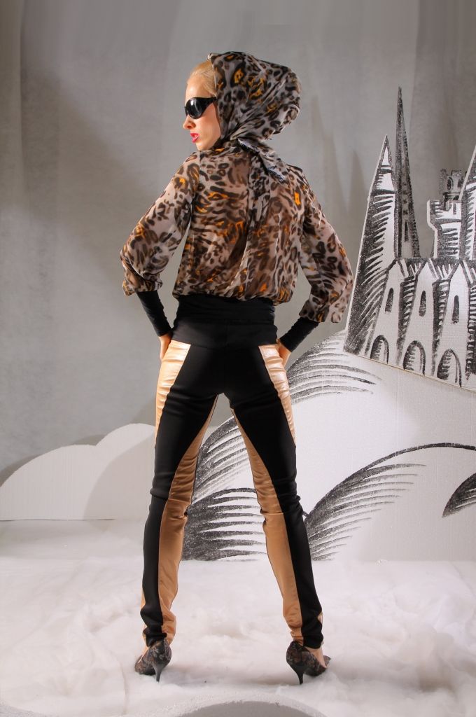 Брюки отличаются не только своим фасоном, но и цветовыми решениями. Длина брюк – по щиколотку. В силу того, что они плотно прилегают к ногам, в них вы визуально будете выглядеть стройнее и изящнее. Отличительная особенность – многочисленные вставки из бежевой ткани. На бёдрах имеются небольшие карманы, придающие данной модели пикантности и некой дерзости.