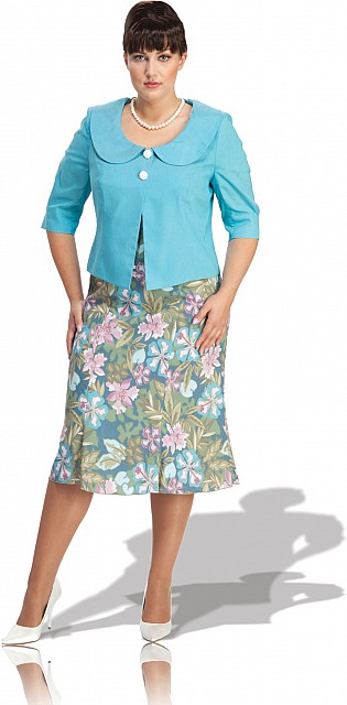 Основа костюма - платье с красочным цветочным принтом стройнящего приталенного покроя с юбкой годе. Дополняет его и придает образу завершенность короткий однотонный жакет с необычной застежкой на две пуговицы, рукавами до локтя и большим круглым воротником, украшающим женственным вырез горловины.