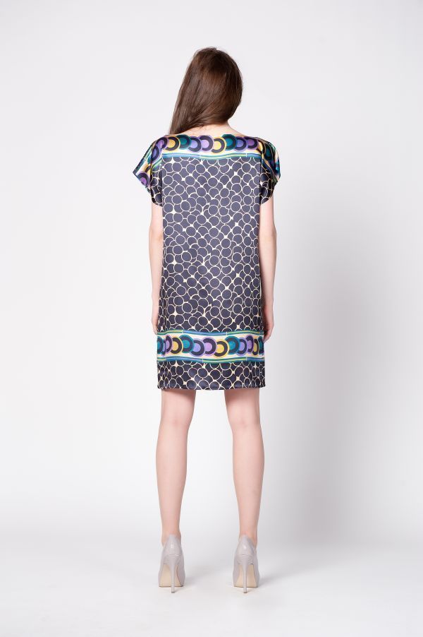 Интересный запоминающийся узор из контрастных колец, украшенный разноцветными дорожками-орнаментами, великолепно подходит для платья лаконичного силуэта, отличающегося простыми линиями и свободным движением высококкачественного натурального материала.