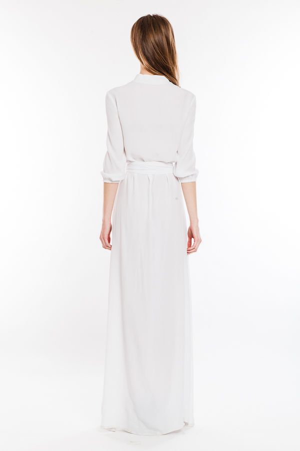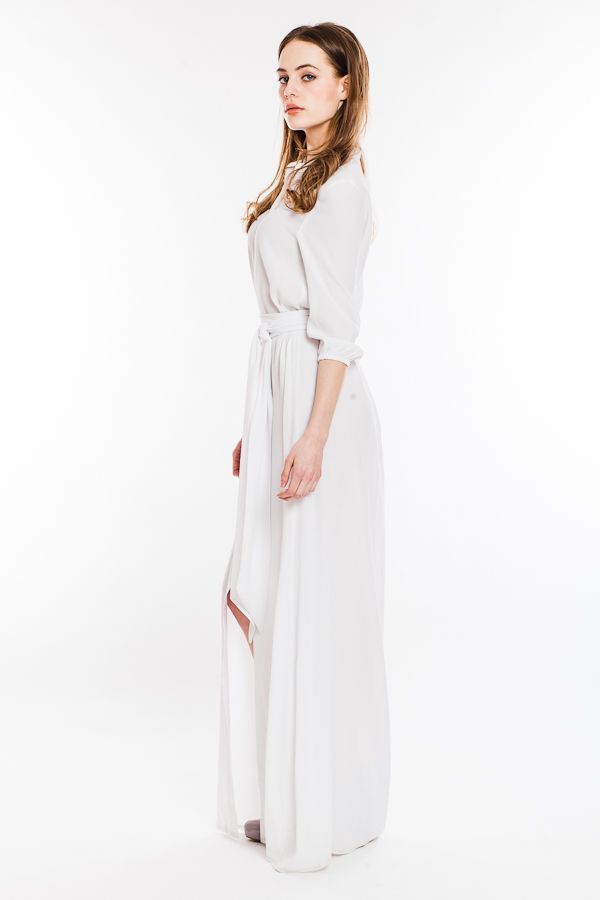 Вам нравится деловой стиль? Вы находите рубашки удобными и красивыми деталями одежды? Обратите внимание на это длинное платье оригинального покроя. Лиф платья выполнен в виде рубашки с воротником-стойкой и рукавами 3/4 на манжетах. Длинная юбка в пол свободная, по центру - продолжение планки с застежками и высокий разрез. Талия подчеркивается широким поясом.