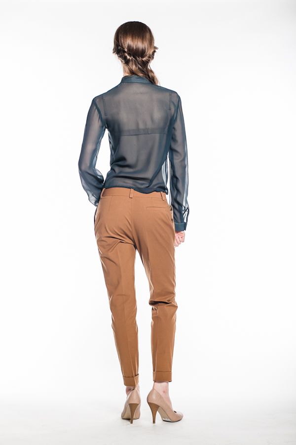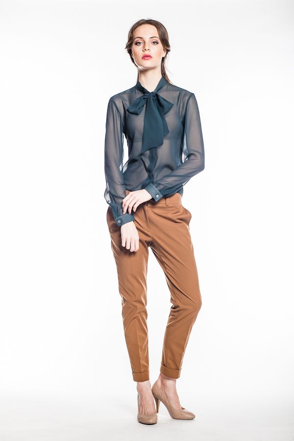 Блуза с длинными рукавами, приталенного, но не обтягивающего покроя. Благодаря универсальной длине чуть выше середины бедра она прекрасно будет смотреться и на выпуск, и заправленной.