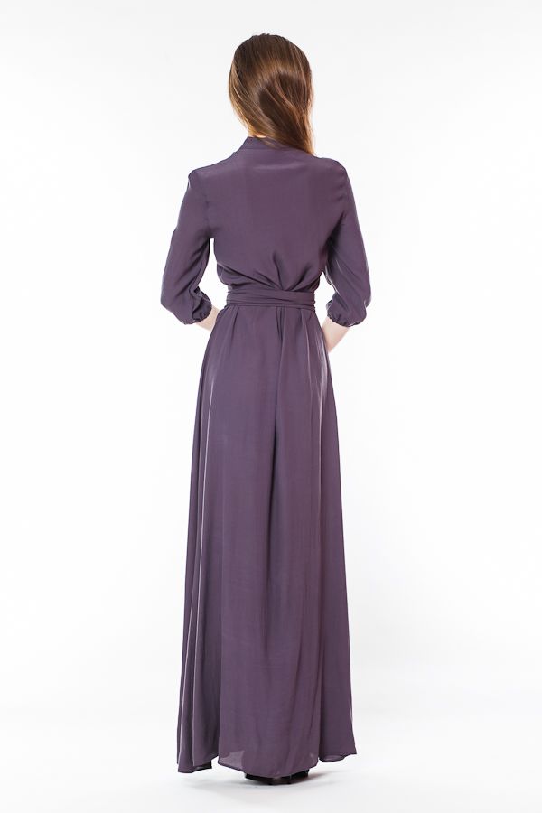 Вам нравится деловой стиль? Вы находите рубашки удобными и красивыми деталями одежды? Обратите внимание на это длинное платье оригинального покроя. Лиф платья выполнен в виде рубашки с воротником-стойкой и рукавами 3/4 на манжетах. Длинная юбка в пол свободная, по центру - продолжение планки с застежками и высокий разрез. Талия подчеркивается широким поясом.