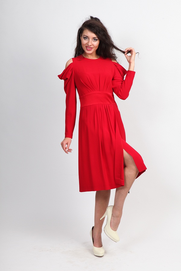 Представляем вам чудесное красное платье из креп-шелка. Оно настолько уникально, что каждая девушка должна такое иметь в своем гардеробе. Широкий пояс подчеркивает красоту фигуры, разрез в нижней части платья придает ему особой женственности. Небольшой вырез круглой формы прелестно смотрится в компании с оригинальными рукавами. Такое платье шикарно подойдет к вечернему мероприятию.