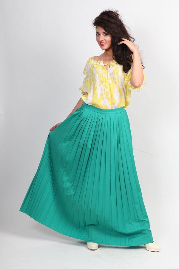 Цветовая гамма блузы представлена белым и желтым тонами, которые воплощают в себе нежность и открытость. Модель имеет свободный крой, рукав три четверти. Особой изюминкой данной блузы является сам фасон, который полностью открывает плечи, блуза держится на плечах при помощи широкой резинки. Такие же резинки идут и на рукавах, обхватывая руку чуть выше локтя.Ткань хлопковая, приятная к телу. Под такую блузу можно подобрать любой низ: от длинной юбки до коротеньких шорт.