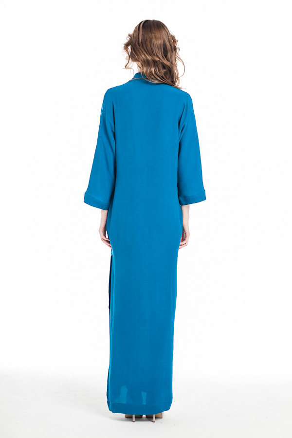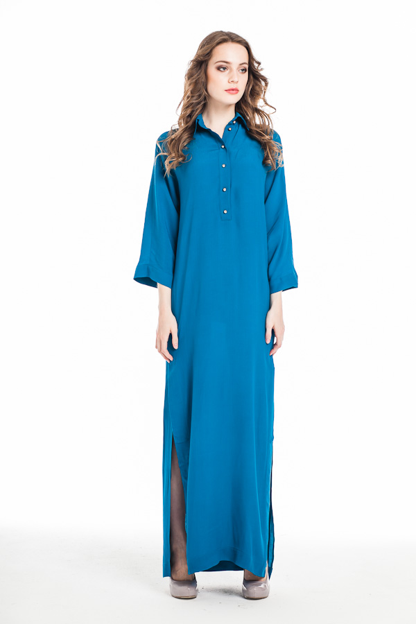 Супер актуальная макси длина, прямой стройнящий покрой, верх в строгом рубашечном стиле с планкой и широкими рукавами 3/4 и неожиданные, дразнящие, интригующие высокие разрезы по бокам, открывающие стройные ноги во время ходьбы и при малейших дуновениях ветра - от вас невозможно отвести глаз!