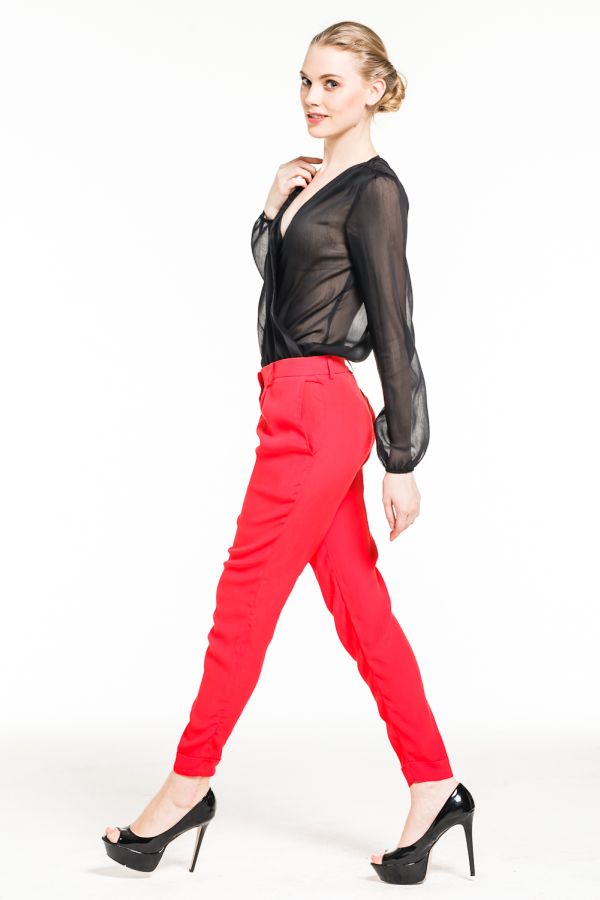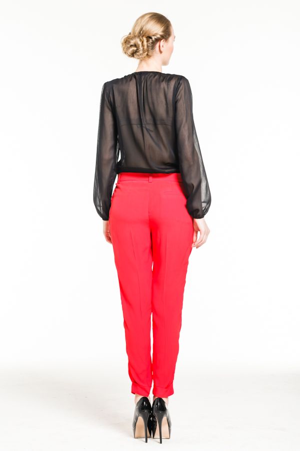 Блуза классического покроя, с неглубоким V-образным вырезом и длинными рукавами, присобранными на тонкие манжеты. Однако именно эта строгость кроя прекрасно гармонирует и подчеркивает сексуальные переливы высококачественного шелка, который мягко ложится на грудь и плечи, красиво обнимает талию и тонкие руки.