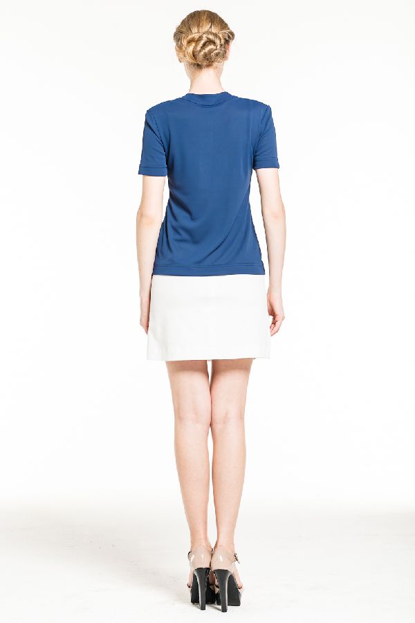 Футболка приталенного покроя, с короткими рукавами. Привлекает внимание оригинальное оформление ворота. Изюминка модели - высокая планка без пуговиц, которая обеспечивает сексуальный глубокий вырез горловины.