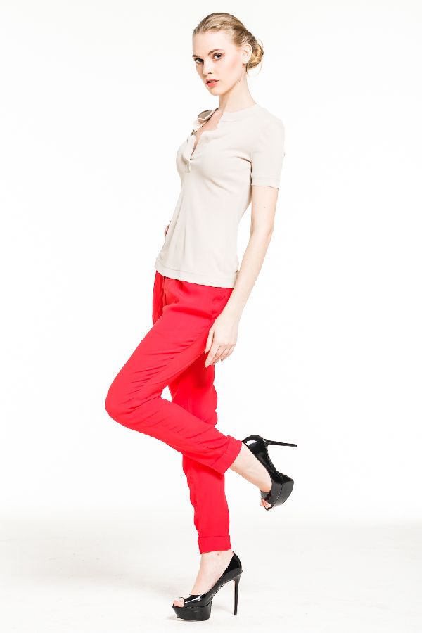 Футболка приталенного покроя, с короткими рукавами. Привлекает внимание оригинальное оформление ворота. Изюминка модели - высокая планка без пуговиц, которая обеспечивает сексуальный глубокий вырез горловины.