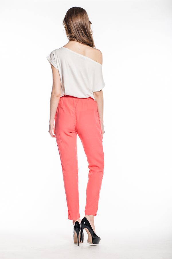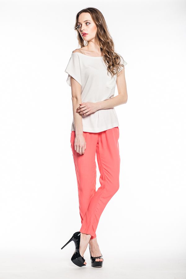 Футболка длиной до середины бедра, это позволяет носить ее и заправленной, и на выпуск. Короткие цельнокроенные рукава приспущены, что придает линии плеч особую мягкость и женственность. Изюминка модели - широкий вырез горловины-лодочка, позволяющий носить блузу на одно плечо, создавая легкий кокетливый образ. К области груди привлекает внимание маенький карманчик.