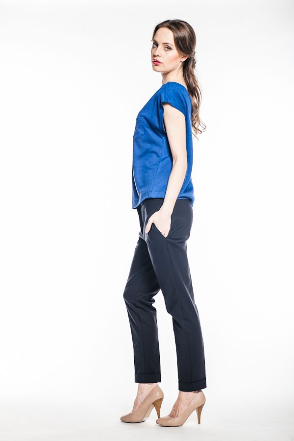 Футболка длиной до середины бедра, это позволяет носить ее и заправленной, и на выпуск. Короткие цельнокроенные рукава приспущены, что придает линии плеч особую мягкость и женственность. Изюминка модели - широкий вырез горловины-лодочка, позволяющий носить блузу на одно плечо, создавая легкий кокетливый образ. К области груди привлекает внимание маенький карманчик.