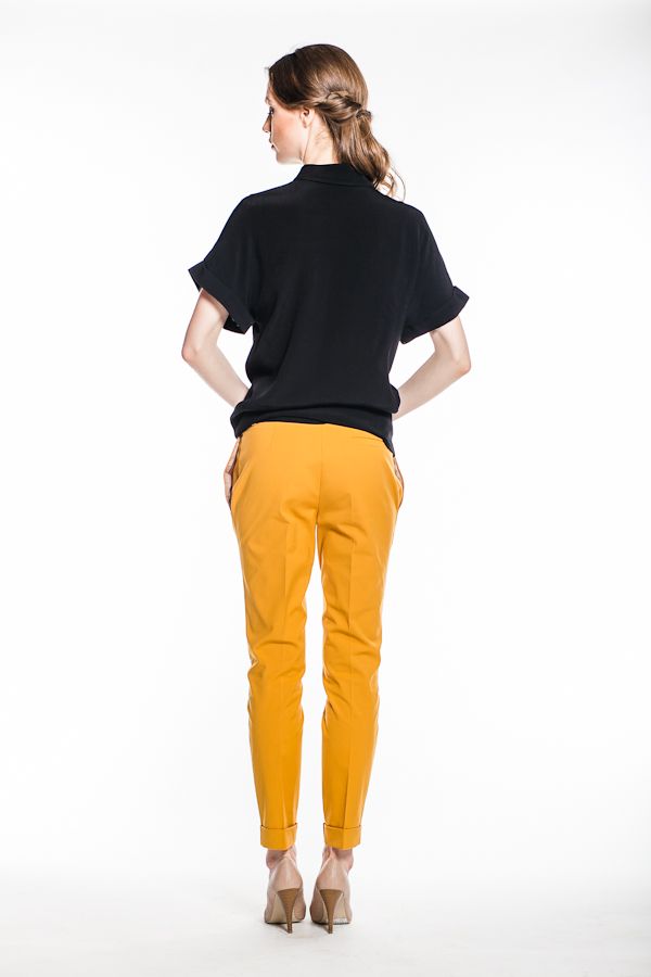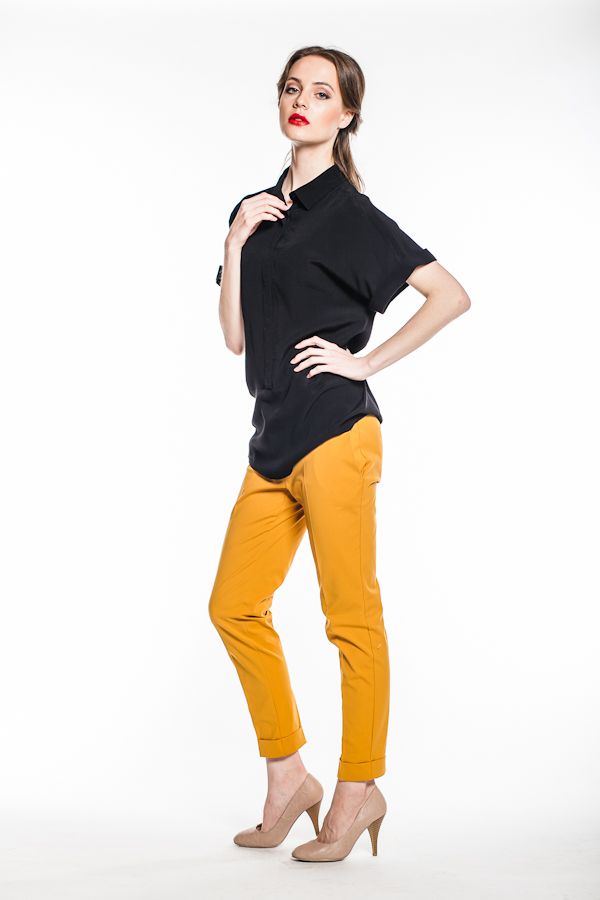 Блуза прямого силуэта, закрывает бедра, но в то же время достаточно легка, чтобы носить ее заправленной в брюки или юбку. Короткие рукава приспущены, что придает линии плеч покатость и женственность. Рубашечный воротник продолжается закрытой планкой, которая не доходит до низа изделия, придавая ему немного неформальный вид.
