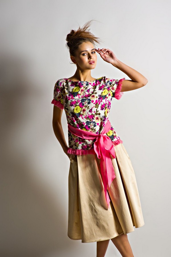 Длина модели - чуть ниже линии колен. Покрой достаточно свободный, благодаря чему, по всему полотнищу юбки появляются хаотичные волнообразные вертикальные складки. Это придаёт наряду некой пикантности.