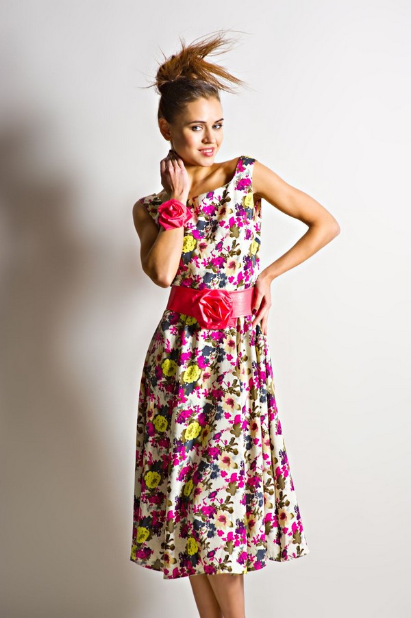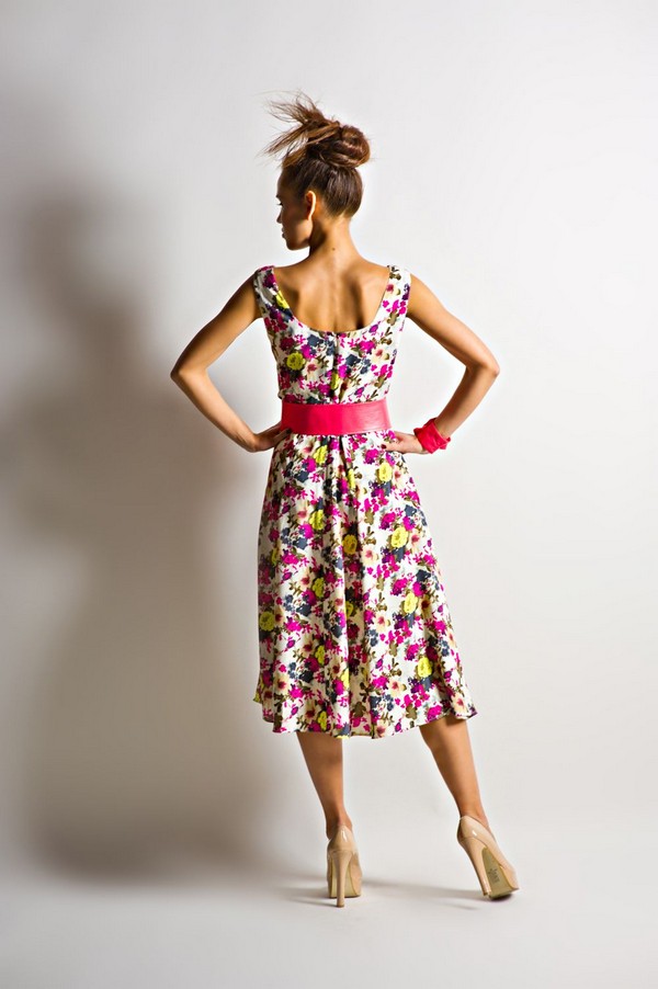 По линии талии проходит широкий ярко-розовый ремень с массивным цветком. Юбка свободная, декорирована волнообразными вертикальными складками. Сзади на спинке вырез намного больше и имеет овальную форму. Застёгивается платье сзади на потайную молнию.
