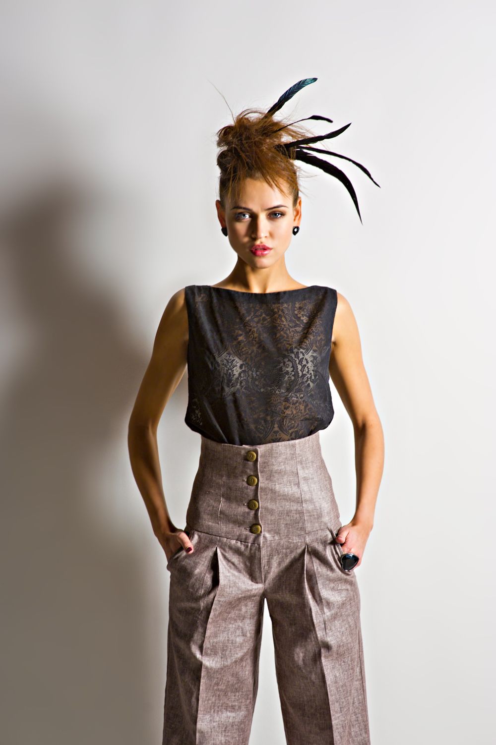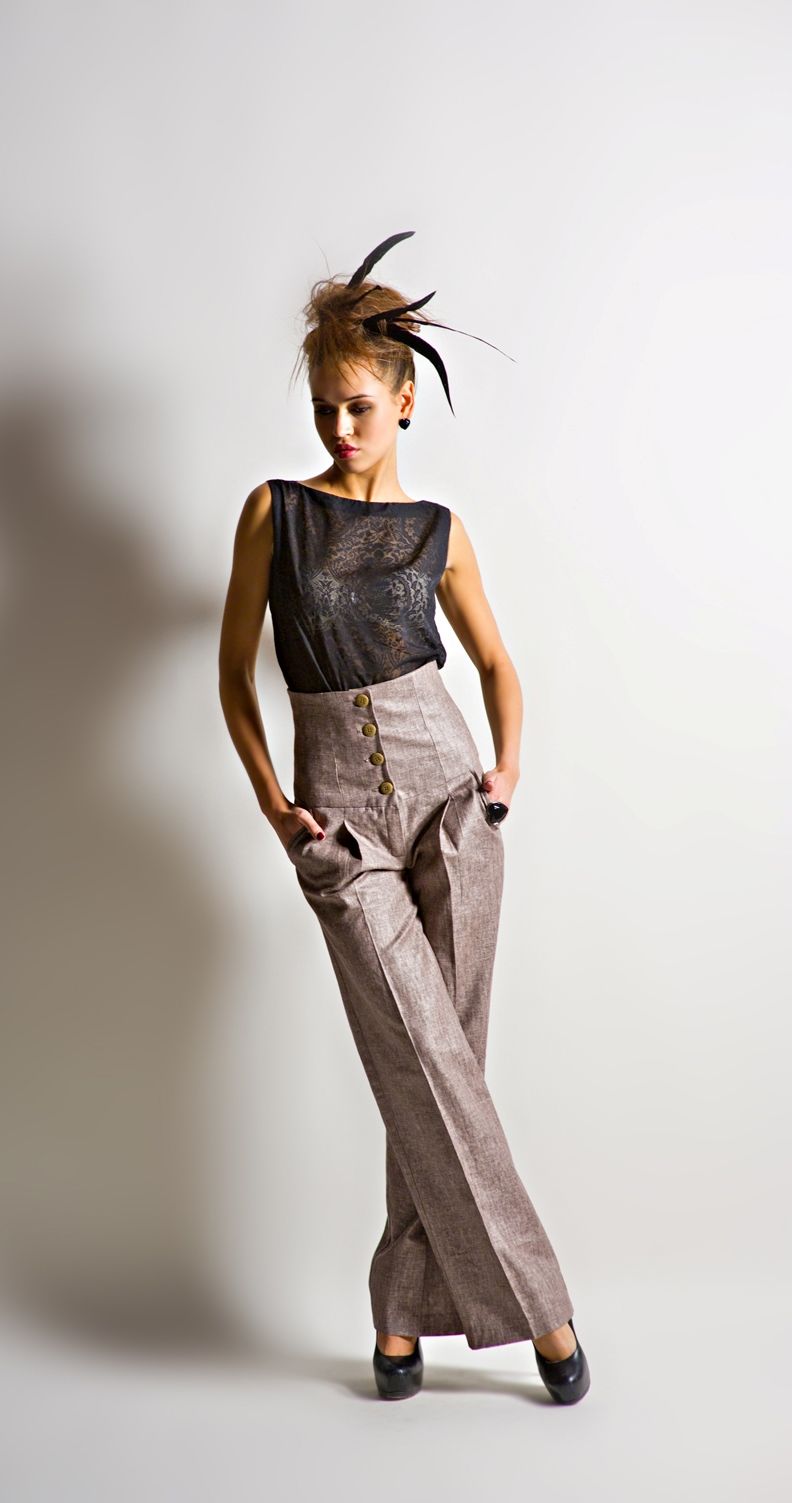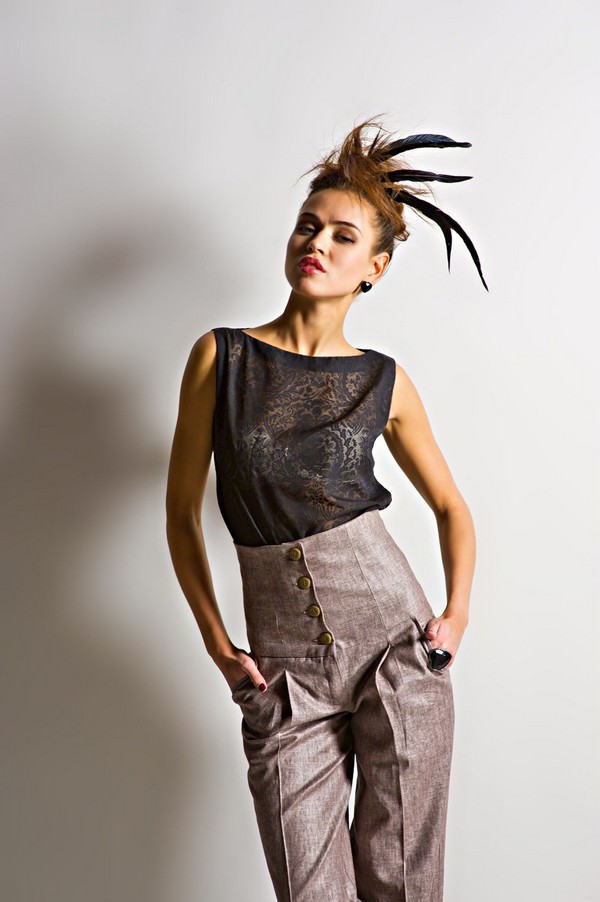 Уникальная особенность модели – её нестандартный покрой. Брюки отличаются завышенной талией, которая поднимается, словно корсет и доходит выше линии талии. Застёгиваются брюки на несколько пуговиц и потайную молнию. Штанины очень свободные, со стрелками. По бокам имеются карманы. Возле карманов – небольшие вертикальные драпировки, которые словно продолжаются в стрелках.