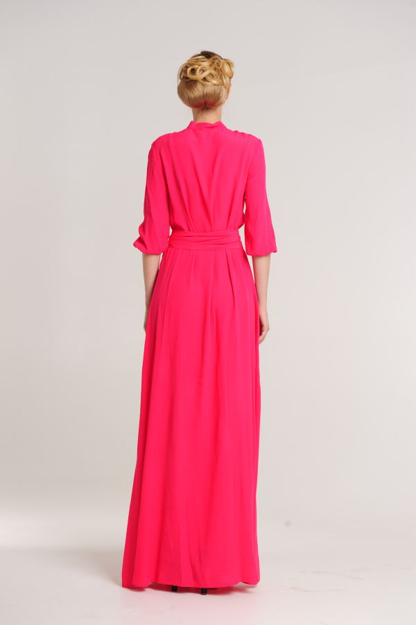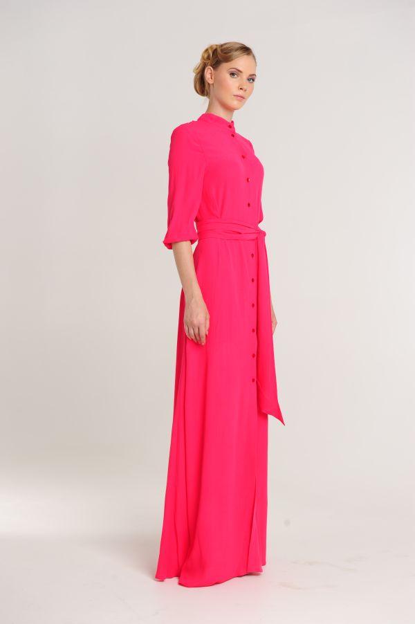Вам нравится деловой стиль? Вы находите рубашки удобными и красивыми деталями одежды? Обратите внимание на это длинное платье оригинального покроя. Лиф платья выполнен в виде рубашки с воротником-стойкой и рукавами 3/4 на манжетах. Длинная юбка в пол свободная, по центру - продолжение планки с застежками и высокий разрез. Талия подчеркивается широким поясом.