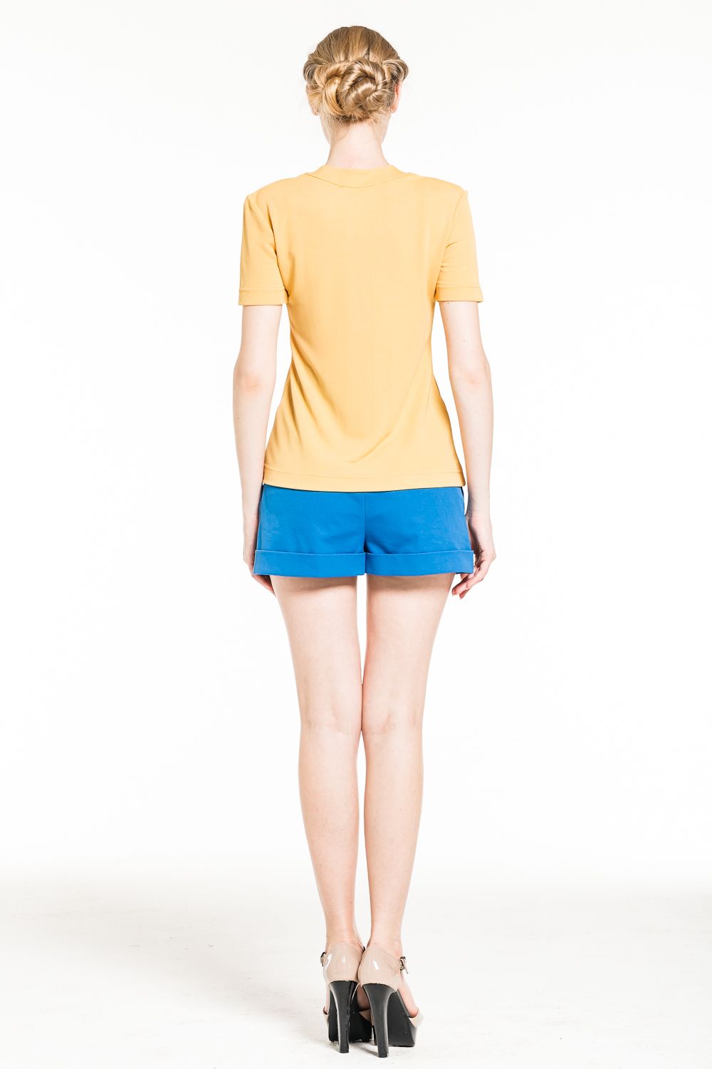 Футболка приталенного покроя, с короткими рукавами. Привлекает внимание оригинальное оформление ворота. Изюминка модели - высокая планка без пуговиц, которая обеспечивает сексуальный глубокий вырез горловины.