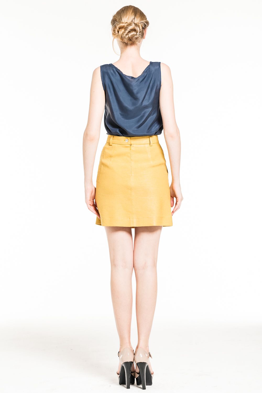Юбка достаточно короткая, формы "трапеция". Благодаря оригинальным деталям смотрится очень интересно и необычно: большие накладные карманы не только удобны, но и диагональными скосами визуально уменьшают объем талии, плавно переходя в широкие шлевки для ремня.