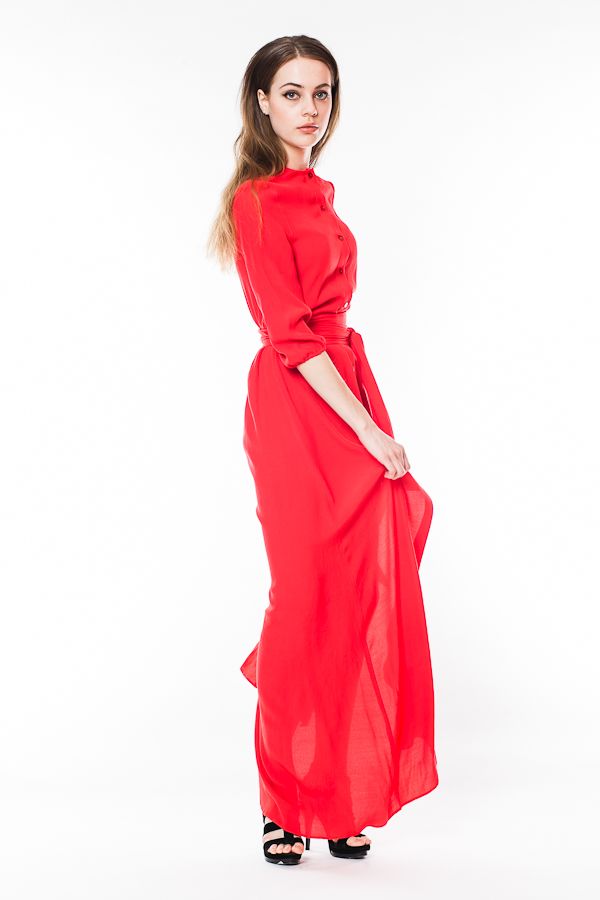 Вам нравится деловой стиль? Вы находите рубашки удобными и красивыми деталями одежды? Обратите внимание на это длинное платье оригинального покроя. Лиф платья выполнен в виде рубашки без воротника и рукавами 3/4 на манжетах. Длинная юбка в пол свободная, по центру - продолжение планки с застежками и высокий разрез. Талия подчеркивается широким поясом.