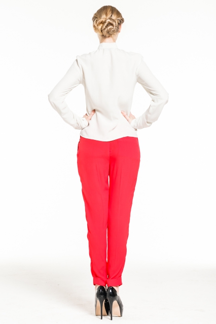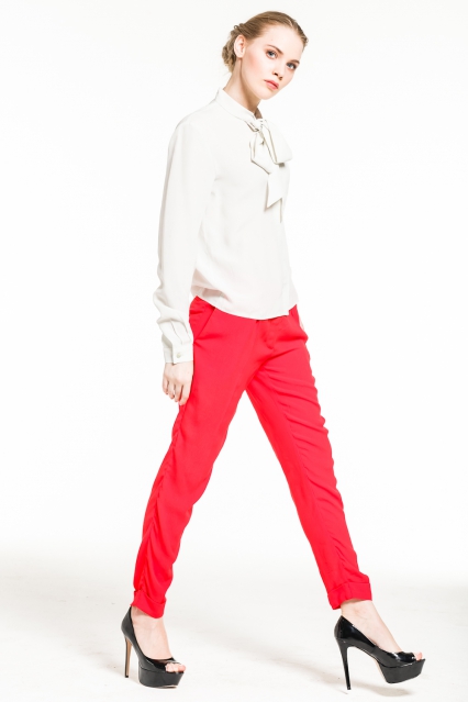 Создать именно такой образ деловой женщины поможет шелковая блуза от Pepen. Блуза классического покроя, с длинными рукавами на манжетах. Подол волнами позволяет носить ее как заправленной, так и на выпуск.