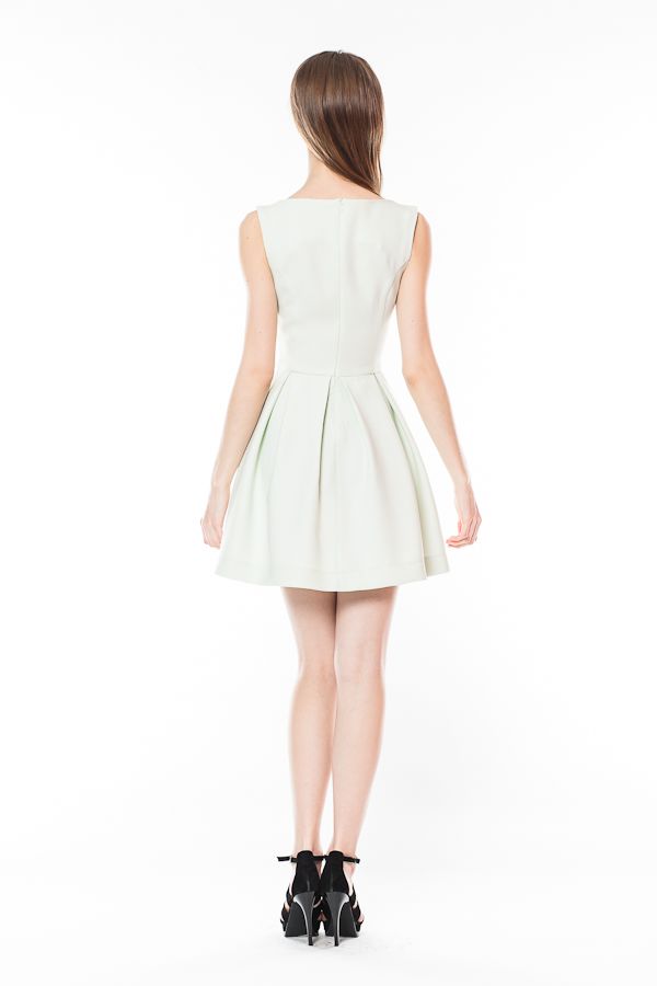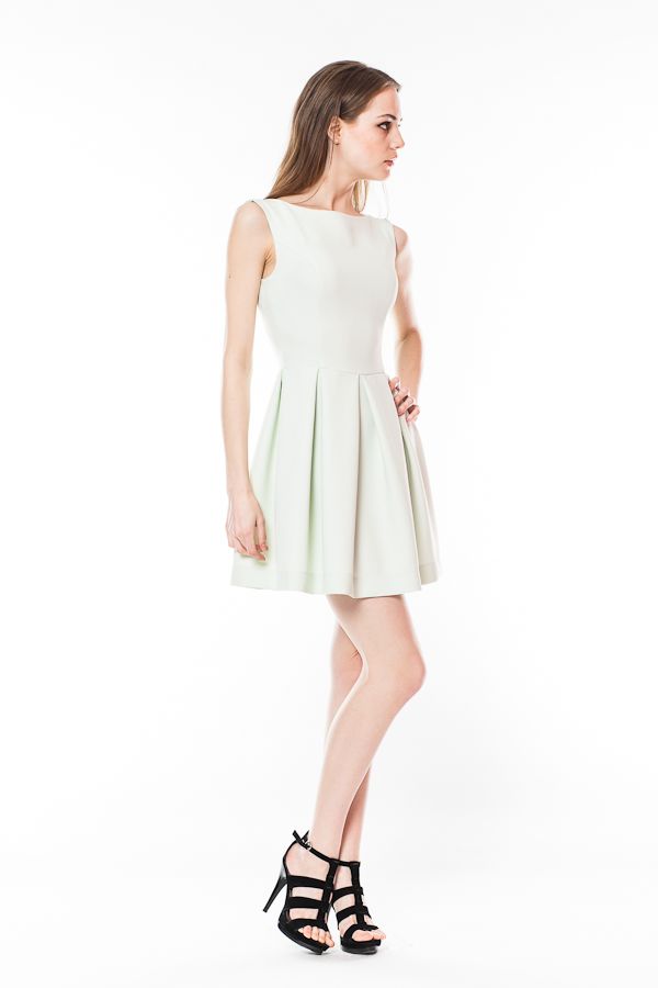 Платье имеет приталенный лиф без рукавов и высокий вырез горловины-лодочка, что придает образу романтичный вид с посылом к ретро-стилю. Юбка платья свободная, образованная широкими складками, длиной выше линии колен. Такой силуэт выглядит очень женственно, подчеркивая талию и придавая бедрам дополнительным объем.