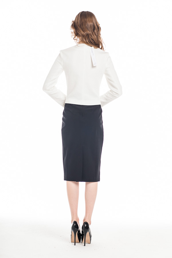 Юбка с поясом, сзади потайная молния. Благодаря невысокому разрезу сзади юбка сохраняет четкие линии и в то же время весьма комфортна и не стесняет ваших движений.