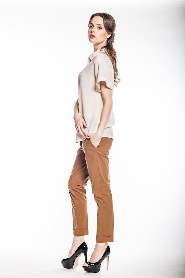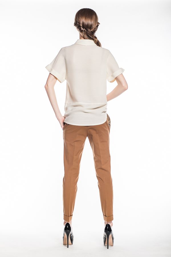 Блуза прямого силуэта, закрывает бедра, но в то же время достаточно легка, чтобы носить ее заправленной в брюки или юбку. Короткие рукава приспущены, что придает линии плеч покатость и женственность. Рубашечный воротник продолжается закрытой планкой, которая не доходит до низа изделия, придавая ему немного неформальный вид.